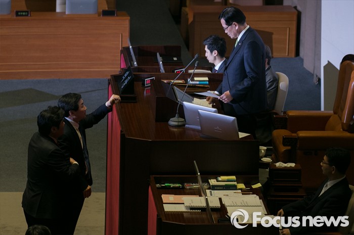(서울=포커스뉴스) 2일 오후 서울 여의도 국회에서 열린 340회 국회(임시회) 7차 본회의에 참석한 이종걸 더불어민주당 원내대표가 정의화 국회의장의 모두발언에 항의하자 원유철 새누리당 원내대표가 말리고 있다.