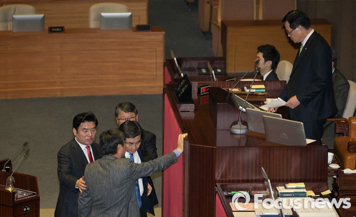 (서울=포커스뉴스) 2일 오후 서울 여의도 국회에서 열린 340회 국회(임시회) 7차 본회의에 참석한 이종걸 더불어민주당 원내대표, 이춘석 원내수석부대표가 정의화 국회의장의 모두발언에 항의하자 원유철 새누리당 원내대표, 조원진 원내수석부대표가 말리고 있다.