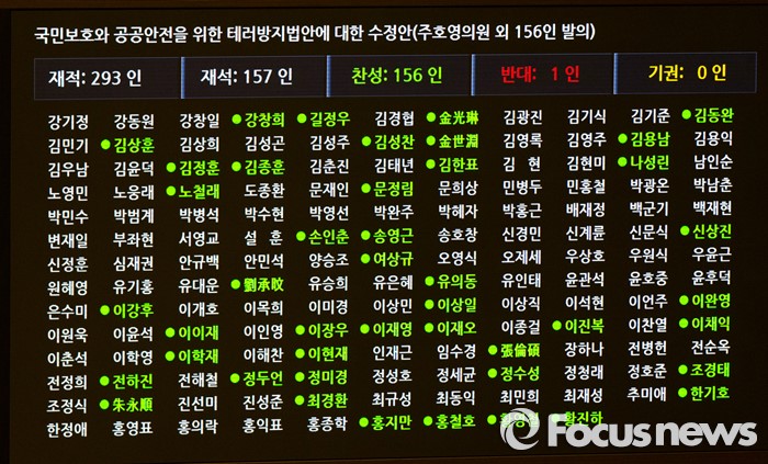 (서울=포커스뉴스) 2일 오후 서울 여의도 국회에서 열린 340회 국회(임시회) 7차 본회의에서 국민보호와 공공안전을 위한 테러방지법안에 대한 수정안(주호영 의원 외 156인 발의)가 재석 157인 중 찬성 156인, 반대 1인으로 통과되고 있다. 야당은 이날 여당의 수정안에 반발해 표결에 참여하지 않은 채 퇴장했다.