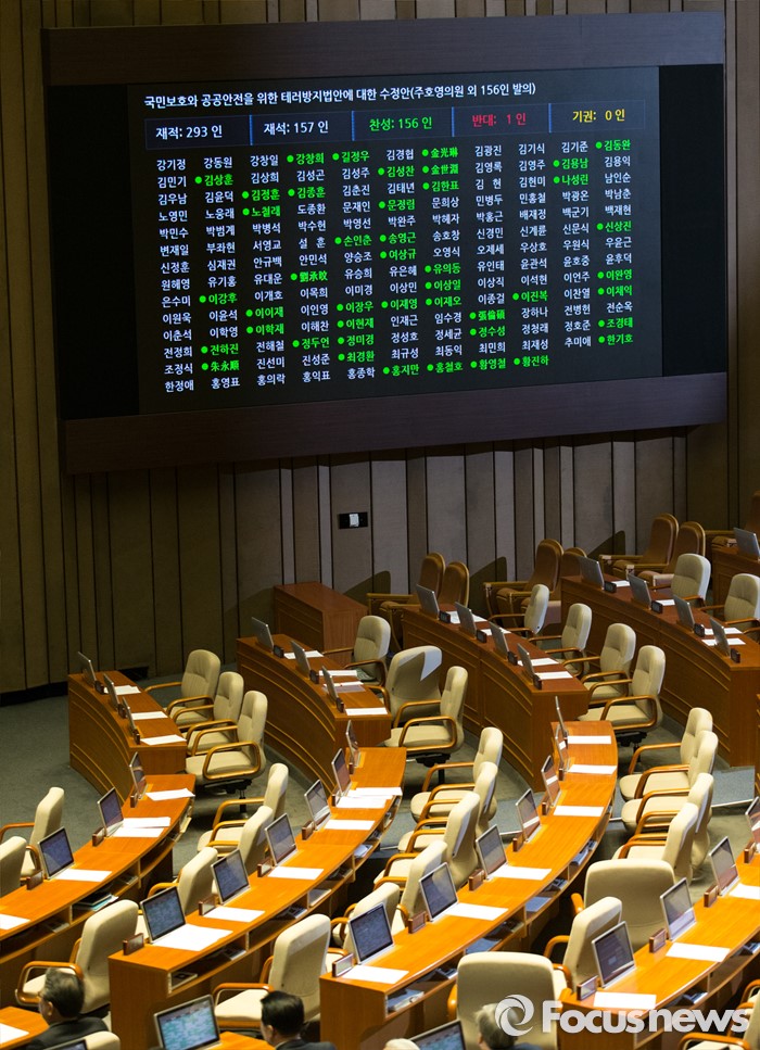 (서울=포커스뉴스) 2일 오후 서울 여의도 국회에서 열린 340회 국회(임시회) 7차 본회의에서 국민보호와 공공안전을 위한 테러방지법안에 대한 수정안(주호영 의원 외 156인 발의)가 재석 157인 중 찬성 156인, 반대 1인으로 통과되고 있다. 야당은 이날 여당의 수정안에 반발해 표결에 참여하지 않은 채 퇴장했다.