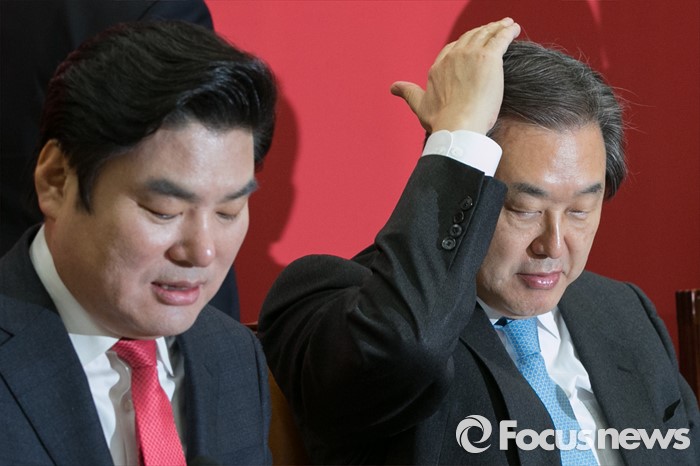 (서울=포커스뉴스) 김무성(오른쪽) 새누리당 대표와 원유철 원내대표가 3일 오전 서울 여의도 국회에서 열린 최고위원회의에 참석해, 회의 시작을 기다리고 있다.