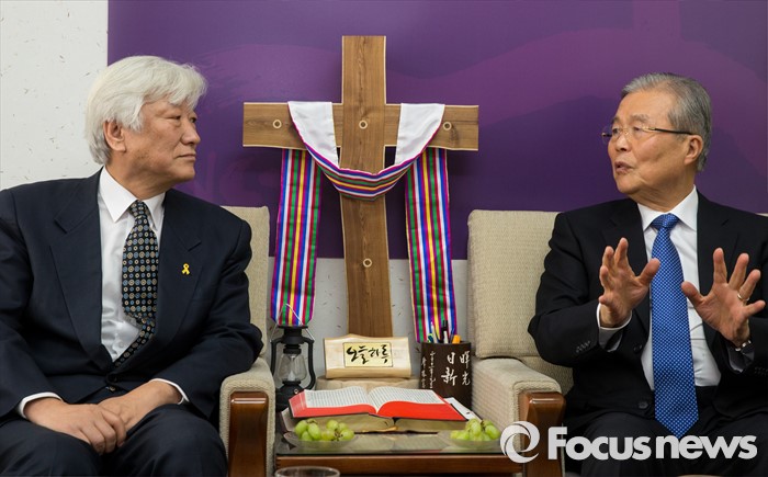 (서울=포커스뉴스) 3일 오전 서울 종로구 한국기독교회관을 방문한 김종인(오른쪽) 더불어민주당 비상대책위원회 대표가 김영주 한국기독교교회협의회 총무를 만나 대화하고 있다.