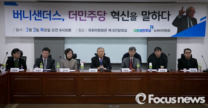 (서울=포커스뉴스) 3일 오전 서울 여의도 국회 의원회관에서 더불어민주당 뉴파티위원회 주최로 열린 '버니 샌더스 더민주 혁신을 말하다' 토론회에 참석한 김종인(왼쪽 네번째) 비대위 대표가 인사말을 하고 있다.
