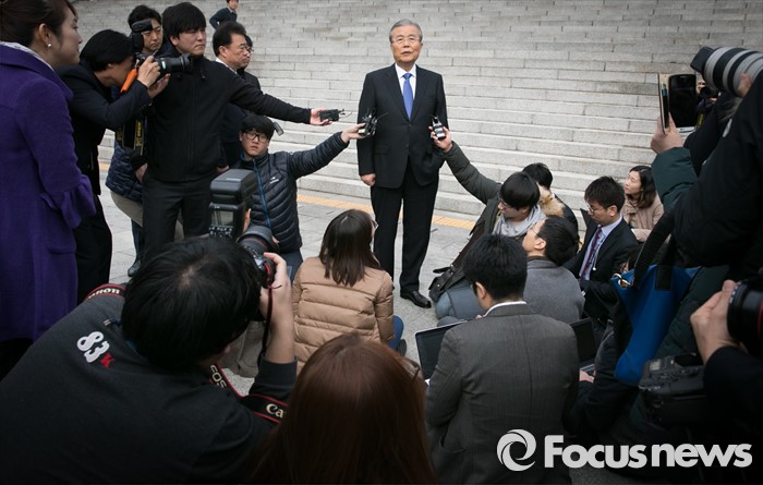 (서울=포커스뉴스) 김종인 더불어민주당 비대위 대표가 3일 오전 서울 여의도 국회 앞에서 열린 달리는 정책의자 발대식에 참석한 뒤 야권 통합 제안과 관련 취재진 질문에 답하고 있다.