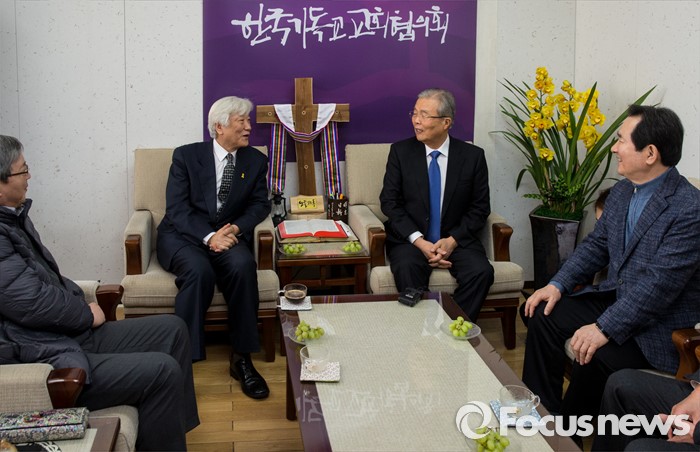 (서울=포커스뉴스) 3일 오전 서울 종로구 한국기독교회관을 방문한 김종인(왼쪽 세번째) 더불어민주당 비상대책위원회 대표가 김영주(왼쪽 두번째) 한국기독교교회협의회 총무를 만나 대화하고 있다.