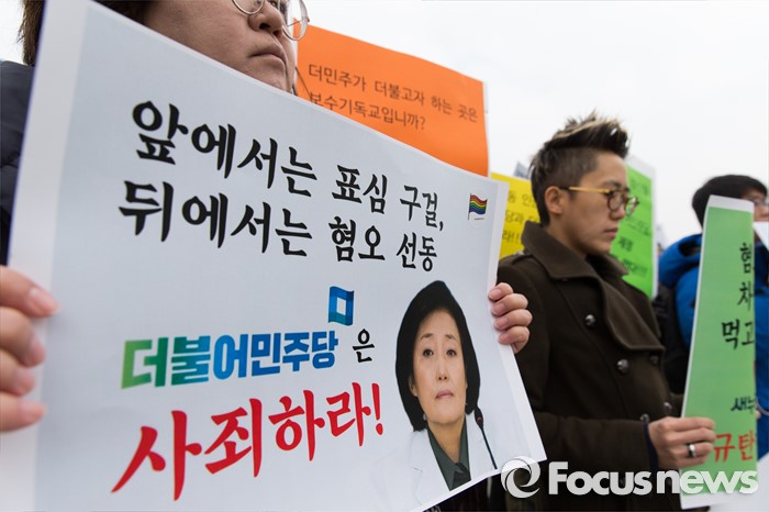 (서울=포커스뉴스) 3일 오전 서울 여의도 국회 앞에서 성소수자차별반대 무지개행동을 비롯한 인권시민사회단체가 성소수자 혐오, 차별에 동조하는 새누리당 김무성 대표와 더불어민주당 박영선 비대위원을 규탄하는 기자회견을 하고 있다.