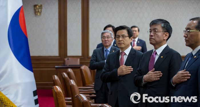 (서울=포커스뉴스) 황교안 국무총리가 3일 오전 서울 종로구 정부서울청사에서 열린 '국무회의'에 자리해 국민의례를 하고 있다.