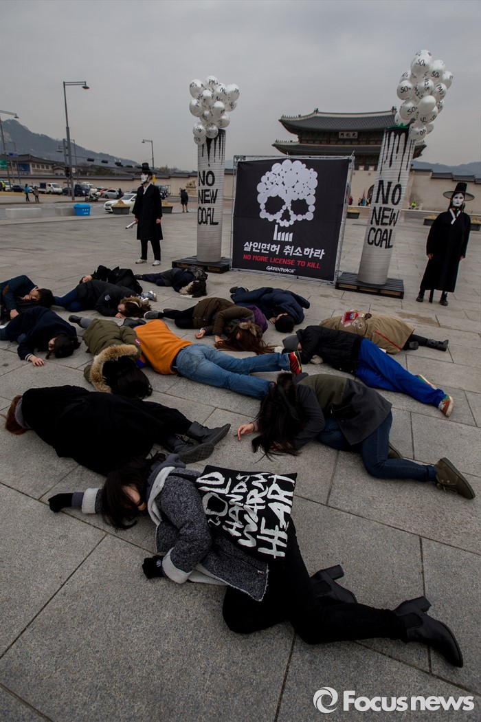(서울=포커스뉴스) 3일 오전 서울 종로구 광화문 광장에서 그린피스 회원들이 충남지역 신규 석탄화력발전소 허가 취소를 촉구하는 퍼포먼스를 펼치고 있다.