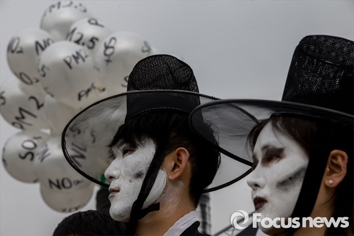 (서울=포커스뉴스) 3일 오전 서울 종로구 광화문 광장에서 그린피스 회원들이 충남지역 신규 석탄화력발전소 허가 취소를 촉구하는 퍼포먼스를 펼치고 있다.