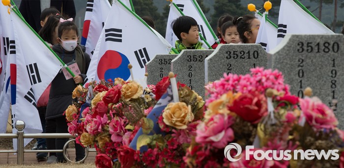 (대전=포커스뉴스) 3일 오전 입학 후 첫 수업에 들어간 대전 화정초등학교 1학년 신입생들이 대전 유성구 국립대전현충원 천안함 46용사 묘역을 찾아 참배하고 있다.