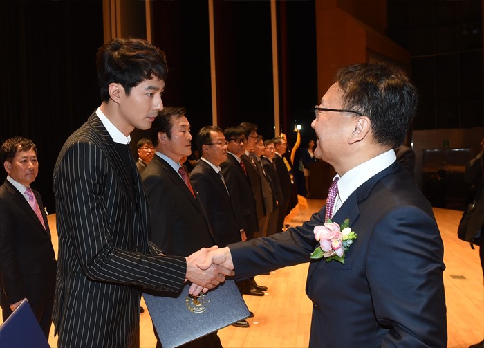 (서울=포커스뉴스) 유일호 부총리 겸 기획재정부 장관이 3일 서울 강남구 코엑스에서 열린 '제50회 납세자의 날'행사 에 참석, 배우 조인성씨에게 모범납세자 대통령표창을 수여하고 있다. <사진제공=기획재정부>