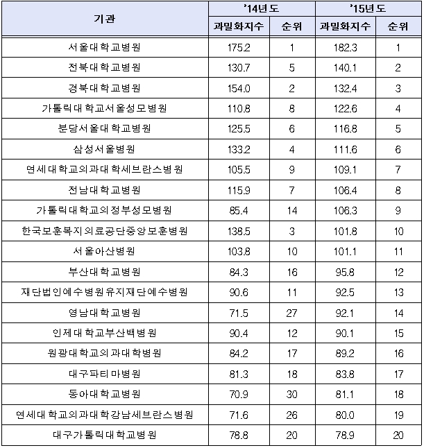 이밖에도 복지부는 응급의료서비스의 질적 개선을 위해 응급의료기관 평가결과와 응급의료수가를 연동하는 방안을 2017년부터 시행한다는 방침이다.응급실 과밀화지수 상위 20개 병원 내역(과밀화지수 = 내원환자의 재실시간 총 합계/(병상수*365일*24시간)) <자료출처=보건복지부>