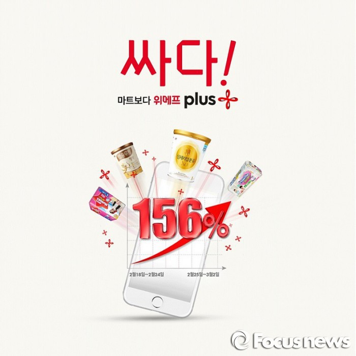 (서울=포커스뉴스) 위메프는 지난 달 25일부터 일주일 동안 ‘싸다! 마트보다 위메프 플러스’ 캠페인을 벌인 결과, 기저귀와 분유 거래액이 캠페인 전주 대비 156% 증가했다고 3일 밝혔다.