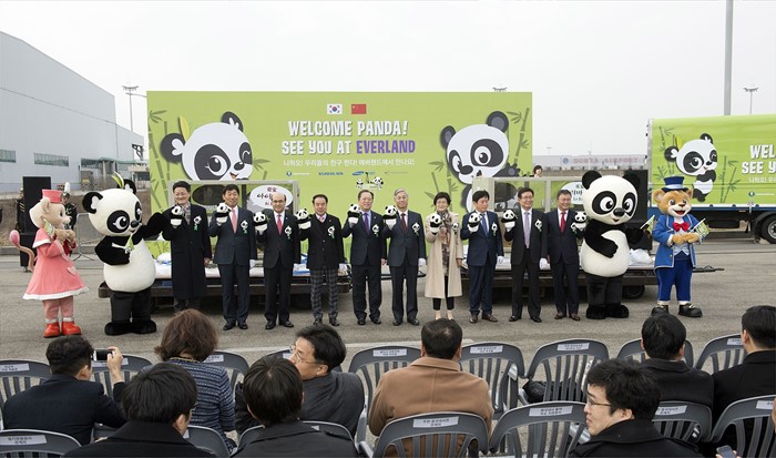 (서울=포커스뉴스) 중국 청두 공항을 출발해 3일 오후 인천공항으로 입국한 판다 러바오(수컷)와 아이바오(암컷)가 공개되고 있다. <사진제공=삼성물산>