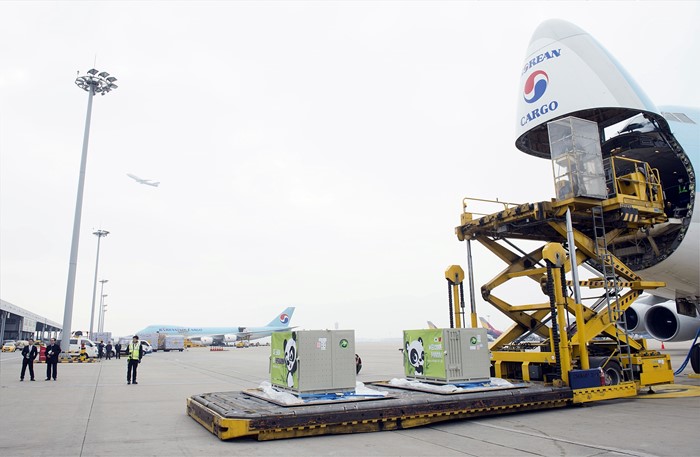 (서울=포커스뉴스) 판다 러바오(수컷)와 아이바오(암컷)가 중국 청두공항을 출발해 3일 오후 인천공항 화물터미널로 도착하고 있다. <사진제공=삼성물산>