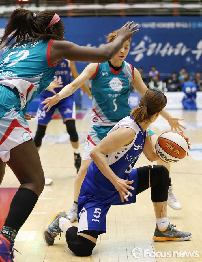 (구리=포커스뉴스) 3일 구리시체육관에서 열린 2015~2016 여자프로농구 KDB생명- KEB하나 경기에서 KDB생명 이경은이 KEB하나 첼시 리와 김이슬의 더블팀 수비에 막혀 무릎을 꿇은채 패스할 곳을 찾고 있다.
