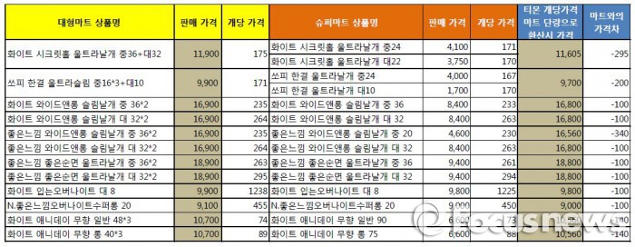 현재 티몬에서 판매하고 있는 여성위생용품 화이트 시크릿홀 24입은 개당 가격 171원, 바디피트 쏘피 한결 24입은 개당 가격 167원이다. 최저가라고 발표한 한 대형마트 판매가보다 각 4원씩 저렴하다.
