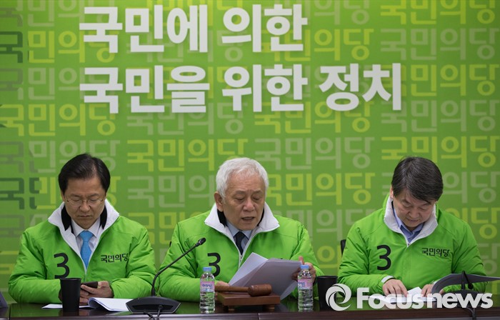 (서울=포커스뉴스) 국민의당 안철수, 천정배 상임공동대표 와 김한길 선거대책위원장이 4일 오전 국민의당 당사에서 열린 4차 선거대책 회의에 참석하고 있다. 오른쪽부터 안 대표, 김한길 선대위원장, 천 대표