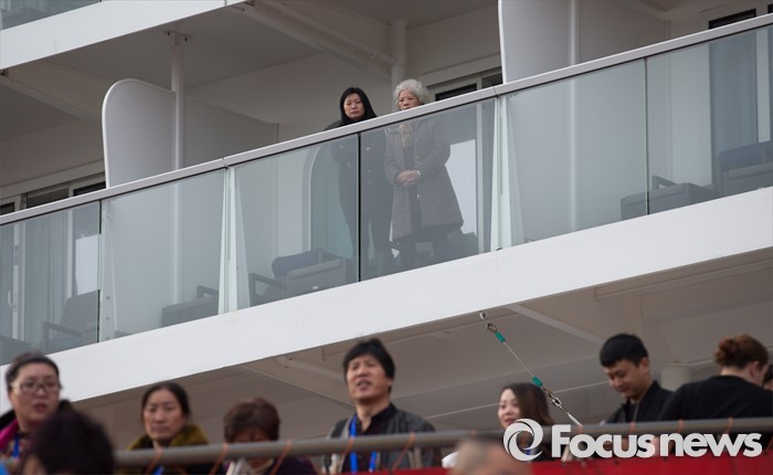 (인천=포커스뉴스) 4일 오전 인천 연수구 송도신항에 정박해 있는 아시아 최대 크루즈인 '퀀텀 오브 더 시즈'호에서 관광객들이 밖을 바라보고 있다.