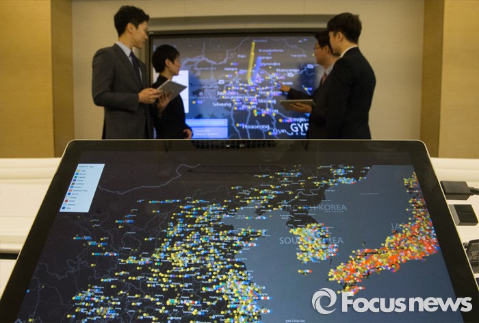 (서울=포커스뉴스) 4일 오전 서울 종로구 한국마이크로소프트에서 열린 '사이버보안센터 개관식'에서 직원들을 비롯한 관계자들이 MALWARE(악성코드) 분포도를 확인하고 있다.