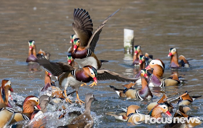 (서울=포커스뉴스) 동면하던 동물이 땅속에서 깨어난다는 경칩을 하루 앞둔 4일 오전 서울 종로구 창경궁 춘당지에서 원앙들이 봄의 기운을 알리듯 힘차게 날갯짓을 하고 있다.