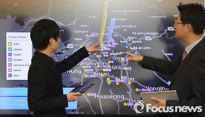 (서울=포커스뉴스) 4일 오전 서울 종로구 한국마이크로소프트에서 열린 '사이버보안센터 개관식'에서 직원들을 비롯한 관계자들이 MALWARE(악성코드) 분포도를 확인하고 있다.