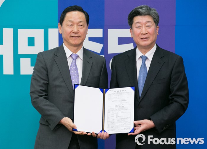 (서울=포커스뉴스) 4일 오후 서울 여의도 국회에서 열린 더불어민주당 인재영입 기자회견에 참석한 김상곤(왼쪽) 인재영입위원장이 윤종기 전 인천경찰청장으로부터 입당원서를 전달받은 뒤 취재진을 향해 포즈를 취하고 있다.