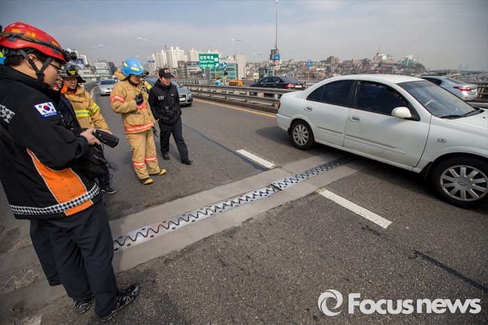 (서울=포커스뉴스) 4일 오후 서울 용산구 반포대교 상판 연결 이음매 부분이 가라앉아 소방대원들이 원인을 조사하고 있다.