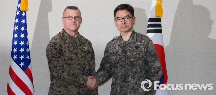 (서울=포커스뉴스) 4일 오후 서울 용산구 국방부에서 열린 주한미군의 사드 배치문제를 협의하기 위한 한·미 공동실무단 첫 회의에서 한국측 대표인 장경수 국방부 정책기획관과 미국측 대표인 헤드룬드 주한미군사령부 기획참모부장이 악수를 하고 있다.