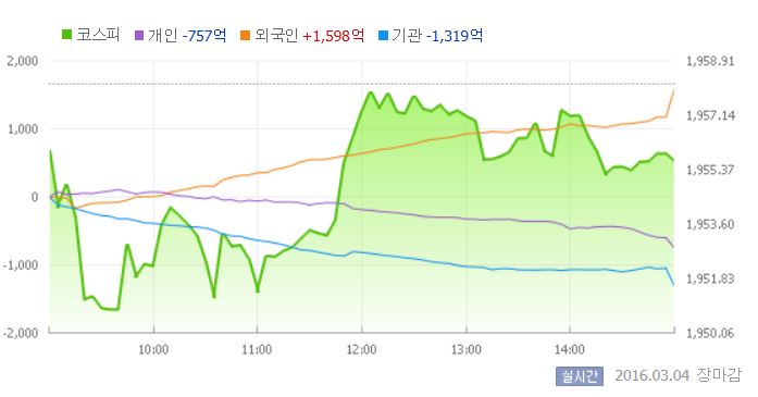 이날 코스피는 1956.01로 출발해 오전 한 때 1940대까지 하락했다. 그러나 장 후반 지수를 끌어올려 1950선은 지켜냈다.