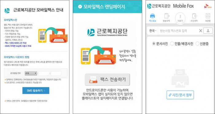 안태호 SK텔링크 기업사업본부장은 “이번 양사간 모바일팩스 서비스 업무협약으로 소규모 사업장들은 개별 팩스기기를 운영하는 것과 동일한 효과를 누릴 수 있게 됐다”고 말했다.근로복지공단의 홈페이지와 연동된 SK텔링크의 모바일팩스 앱 화면.<사진제공=SK텔링크>