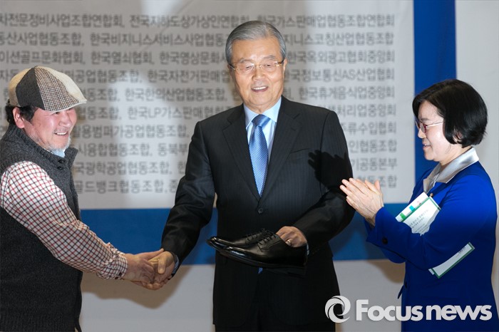 (서울=포커스뉴스) 김종인(가운데) 더불어민주당 비대위 대표가 4일 오후 서울 여의도 국회 의원회관에서 열린 소상공인 20대 총선 정책공약 전달식에 참석해, 구두장인(왼쪽)으로부터 구두를 받고 있다. 오른쪽은 전순옥 더민주 의원.