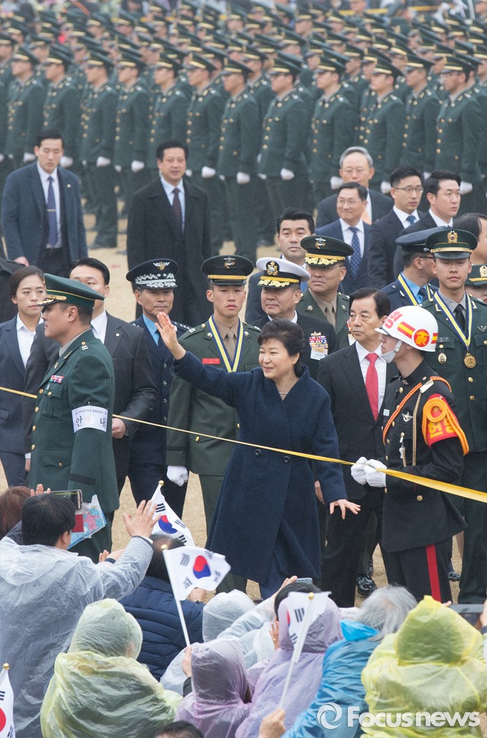 (계룡=포커스뉴스) 4일 오후 충남 계룡대 연병장에서 열린 2016년 장교 합동임관식에서 박근혜 대통령이 신임 장교들과 가족들에게 인사를 하고 있다.