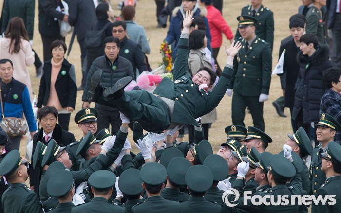 (계룡=포커스뉴스) 4일 오후 충남 계룡대 연병장에서 열린 2016년 장교 합동임관식에서 신임장교들이 행가래를 치고 있다.