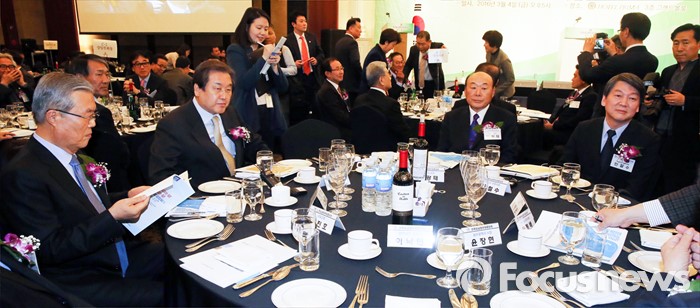 (서울=포커스뉴스) 김무성(왼쪽 두번째) 새누리당 대표, 김종인(왼쪽 첫번째) 더불어민주당 비대위 대표, 안철수(오른쪽 첫번째) 국민의당 상임공동대표가 4일 오후 서울 강남구 프리마호텔에서 열린 전국호남향우회 정기총회에 참석해 자리하고 있다. 오른쪽 두번째는 박광태 전국호남향우회중앙회장.
