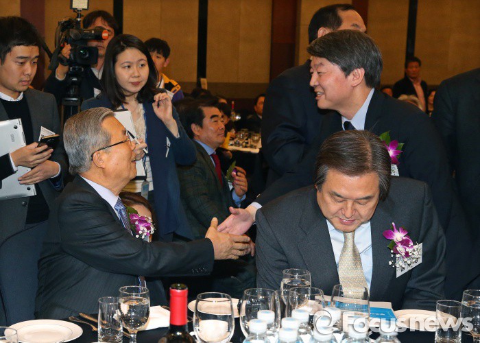 (서울=포커스뉴스) 4일 오후 서울 강남구 프리마호텔에서 열린 전국호남향우회 정기총회에 참석한 김무성(오른쪽 아래) 새누리당 대표 뒤로 김종인(왼쪽) 더불어민주당 비대위 대표와 안철수 국민의당 상임공동대표가 악수를 하고 있다.