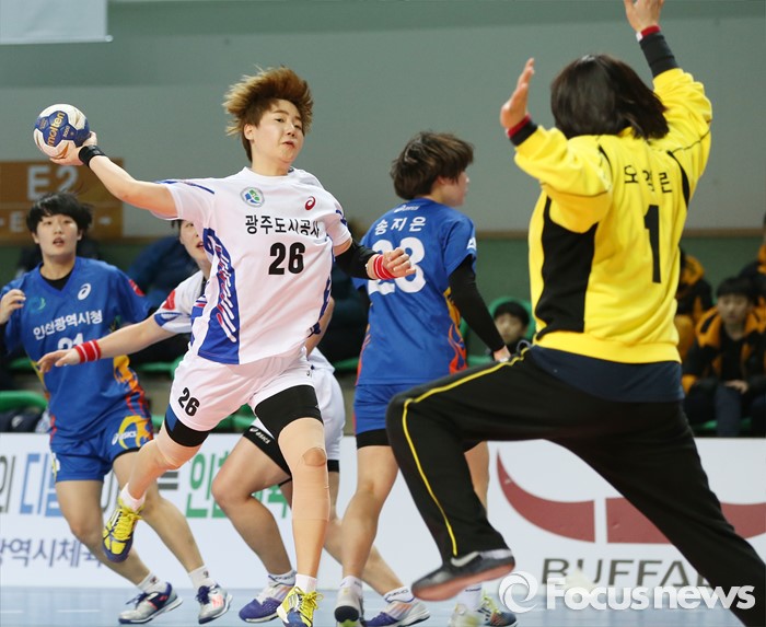 (인천=포커스뉴스) 4일 인천선학체육관에서 열린 2016 SK 핸드볼 코리아리그 여자부 인천시청-광주도시공사 경기에서 광주도시공사 조효비가 인천시청 골키퍼 오영란의 허점을 찾아 슈팅하고 있다.