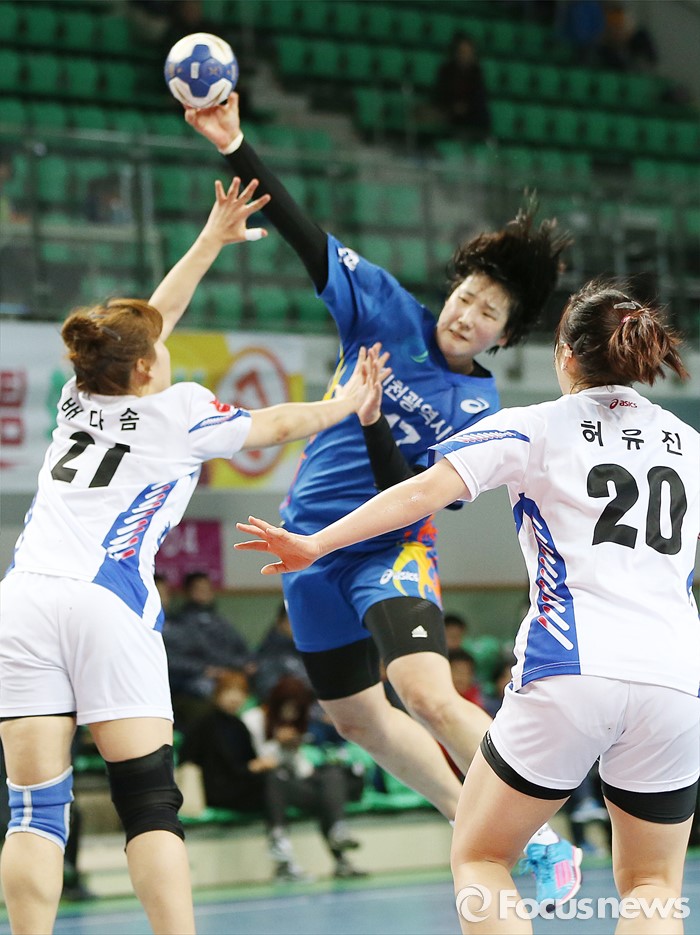 (인천=포커스뉴스) 4일 인천선학체육관에서 열린 2016 SK 핸드볼 코리아리그 여자부 인천시청-광주도시공사 경기에서 인천시청 김희진이 광주도시공사 배다솜의 마크 위로 슈팅하고 있다.