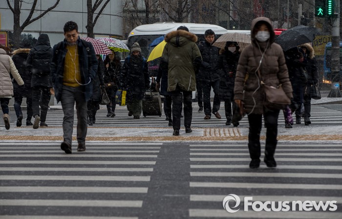 | △ 눈 맞으며 출근길 재촉하는 직장인들 |