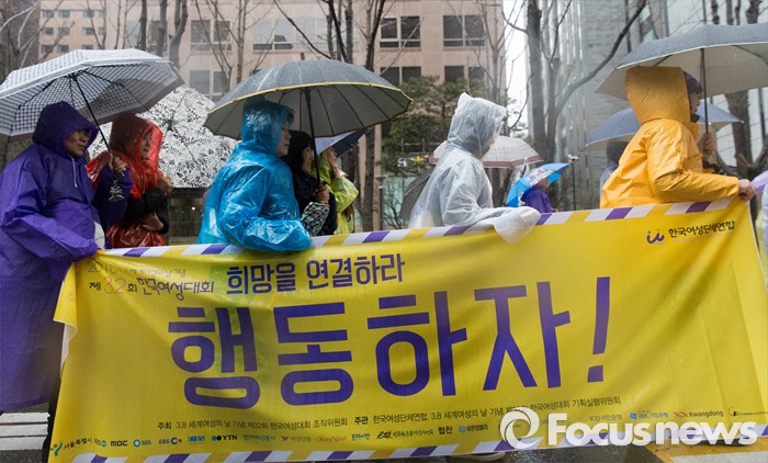 (서울=포커스뉴스) 5일 오후 세계여성의날(3월8일) 기념 제32회 한국여성대회를 마친 참가자들이 서울 종로구 일본대사관을 향해 행진하고 있다.