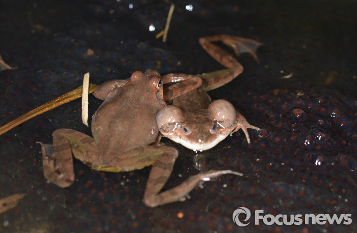 (영암=포커스뉴스) 전국적으로 봄비가 내리고 절기상경칩인 5일 전남 영암군 영암읍 월출산 자락에 겨울잠에서 깨어난 산개구리 한쌍이 사랑을 나누고 있다.. <사진제공=김현태 양서류연구가>