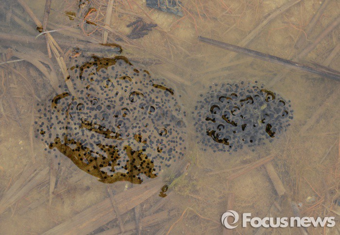 (영암=포커스뉴스) 전국적으로 봄비가 내리고 절기상경칩인 5일 전남 영암군 영암읍 월출산 자락의 계단논에 겨울잠에서 깨어난 산개구리들이 산란한 알이 뭉쳐 있다. <사진제공=김현태 양서류연구가>