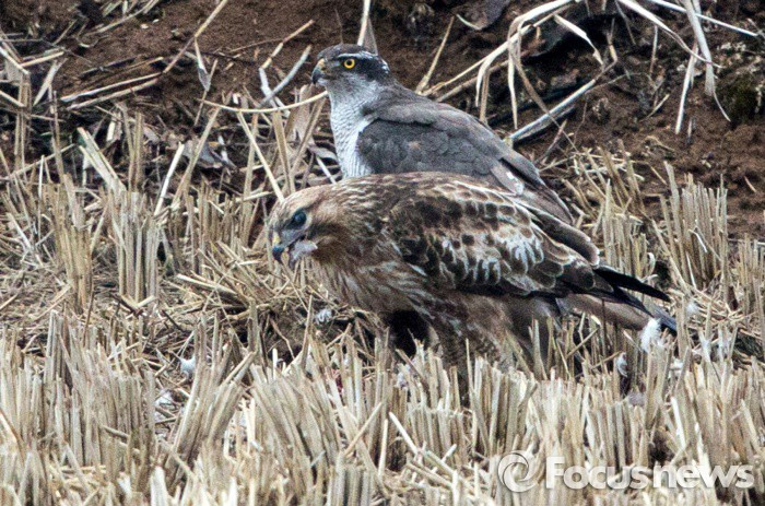 (철원=포커스뉴스) 북상길에 오른 멸종위기종 말똥가리(앞쪽)가 6일 오전 강원 철원군 동송읍 한탄강변에서참매(뒷쪽)가 사냥한 고방오리를 빼앗아 뜯고 있다.