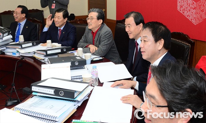 (서울=포커스뉴스) 6일 오전 서울 여의도 새누리당사에서 실시된 공천면접에서 이한구 공천관리위원장과 공천관리위원들이 공천면접에 참석한 김무성 대표와 이야기를 나누며 웃고 있다.
