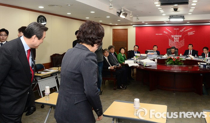 (서울=포커스뉴스) 6일 오전 서울 여의도 새누리당사에서 실시된 공천면접에 참석한 김무성 대표가 면접장에 입장하면서 이한구 공천관리위원장과 공천괸리위원들에게 인사를 하고 있다.