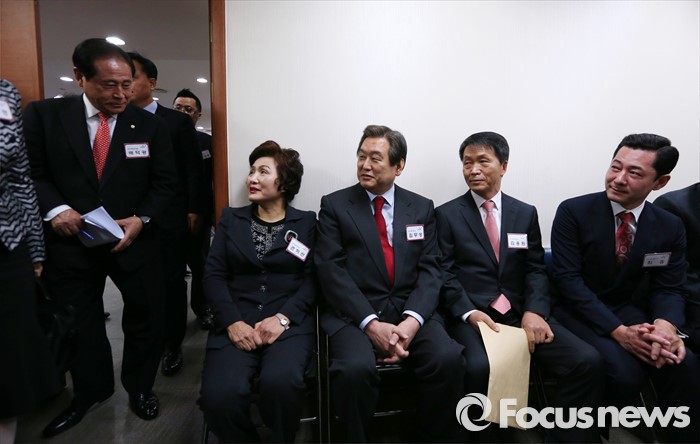 (서울=포커스뉴스) 부산 중구·영도구에 출마하는 김무성 새누리당 대표(오른쪽 세번째)가 6일 오전 서울 여의도 당사에 마련된 공천 심사 면접장 앞에서 예비후보들과 대기하고 있다.