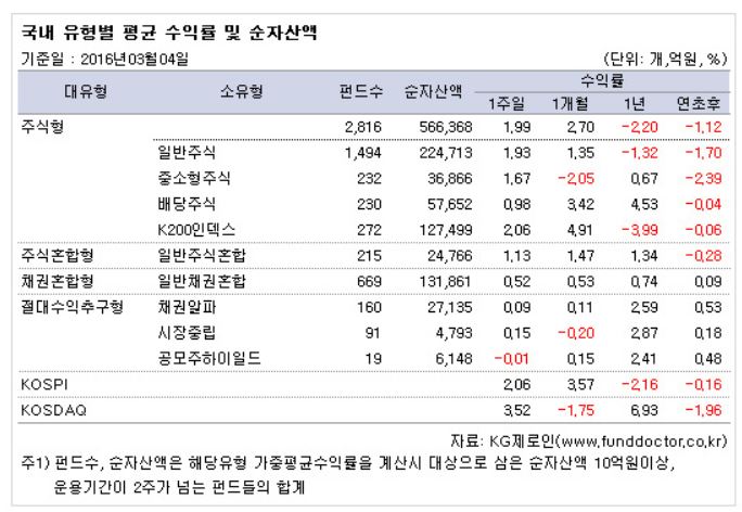 6일 펀드평가사 KG제로인이 지난 4일 공시된 기준 가격으로 펀드 수익률을 조사한 결과, 전체 국내 주식형펀드는 한 주간 1.99% 상승했다.