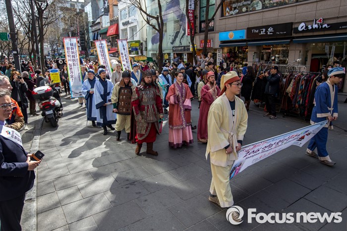 (서울=포커스뉴스) 6일 오후 서울 종로구 인사동에서 '2016 영암왕인문화축제'를 알리기 위한 '왕인박사 일본가오' 퍼레이드가 펼쳐지고 있다.