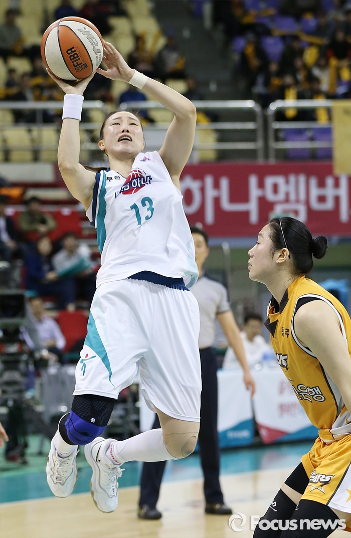 (부천=포커스뉴스) 6일 부천체육관에서 열린 2015-2016 여자프로농구 KEB하나은행-KB스타즈 경기에서 KEB하나 김정은이 KB스타즈 강아정을 앞에두고 점프슛을 쏘고 있다.