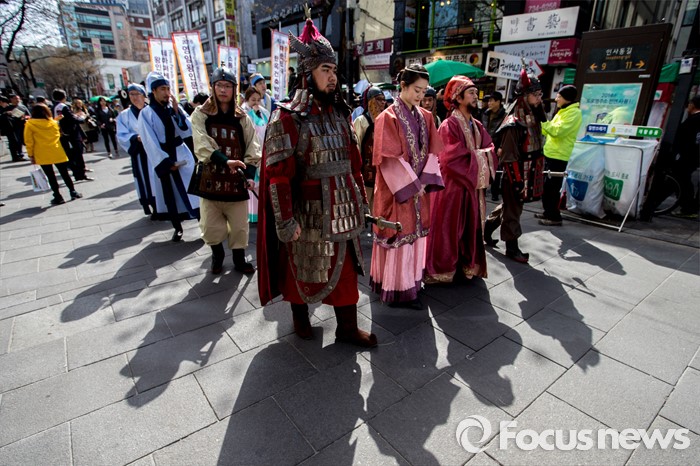 (서울=포커스뉴스) 6일 오후 서울 종로구 인사동에서 '2016 영암왕인문화축제'를 알리기 위한 '왕인박사 일본가오' 퍼레이드가 펼쳐지고 있다.